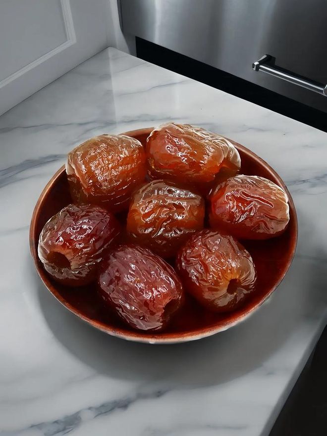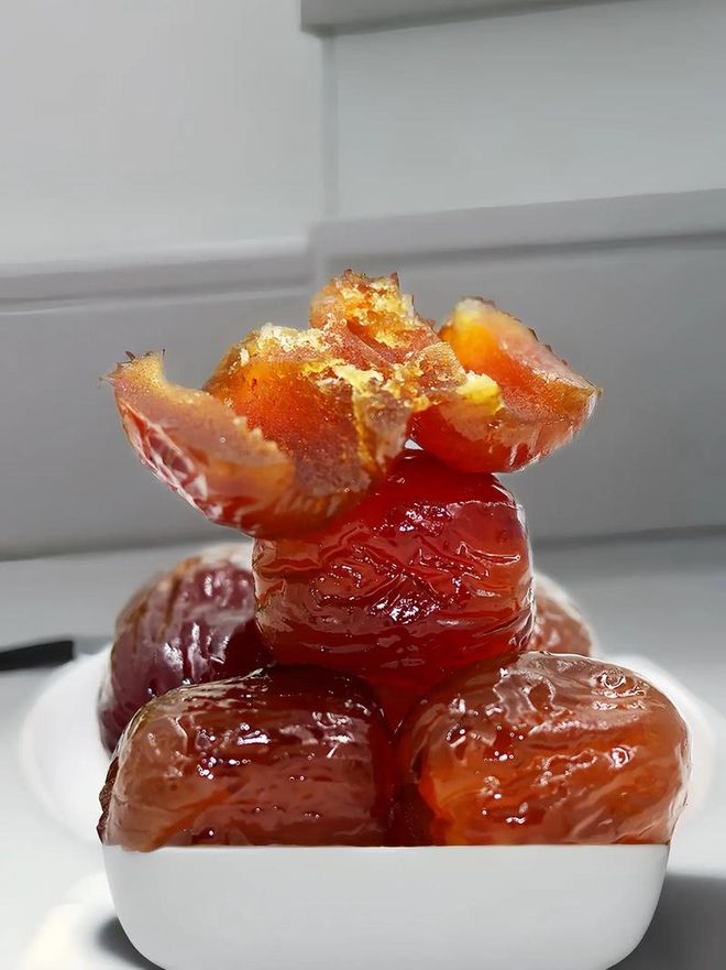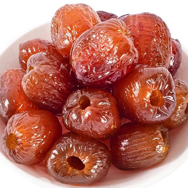 蜜枣在中国传统饮食中多用于甜品制作,如八宝粥、粽子、月饼馅料,或直接作为零食。江浙一带的“金丝蜜枣”和福建的“芙蓉李干”是地方特色蜜饯的代表。